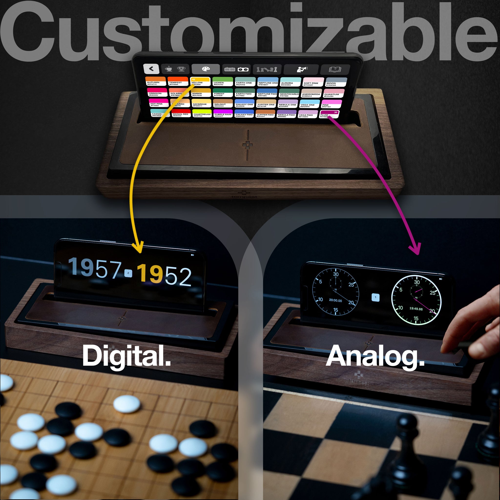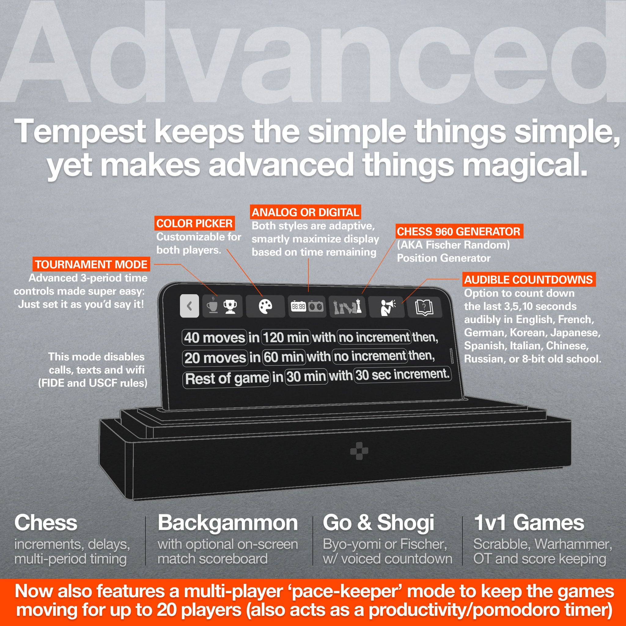 Tempest chess clocks are refined, smart, evolving and battle ready. It's your move..