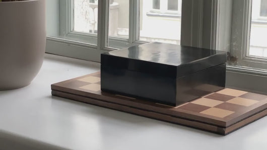 The MagSplit board is made with black walnut and maple squares and solid black walnut frame. A great contrast of woods for the battle field and perfectly paired with any of our chess sets and clocks (not included). It has strong hidden magnets that seamlessly connect the board for play with no gap down the middle (as is common with hinged boards). It's just like a premium full sized tournament board (19.5" x 19.5" with official regulation 2.25" squares) except that it's portable! The invisble magnetic clasp system splits in half and in a moment its packed up and ready to go (thanks to the included All-in Bag).