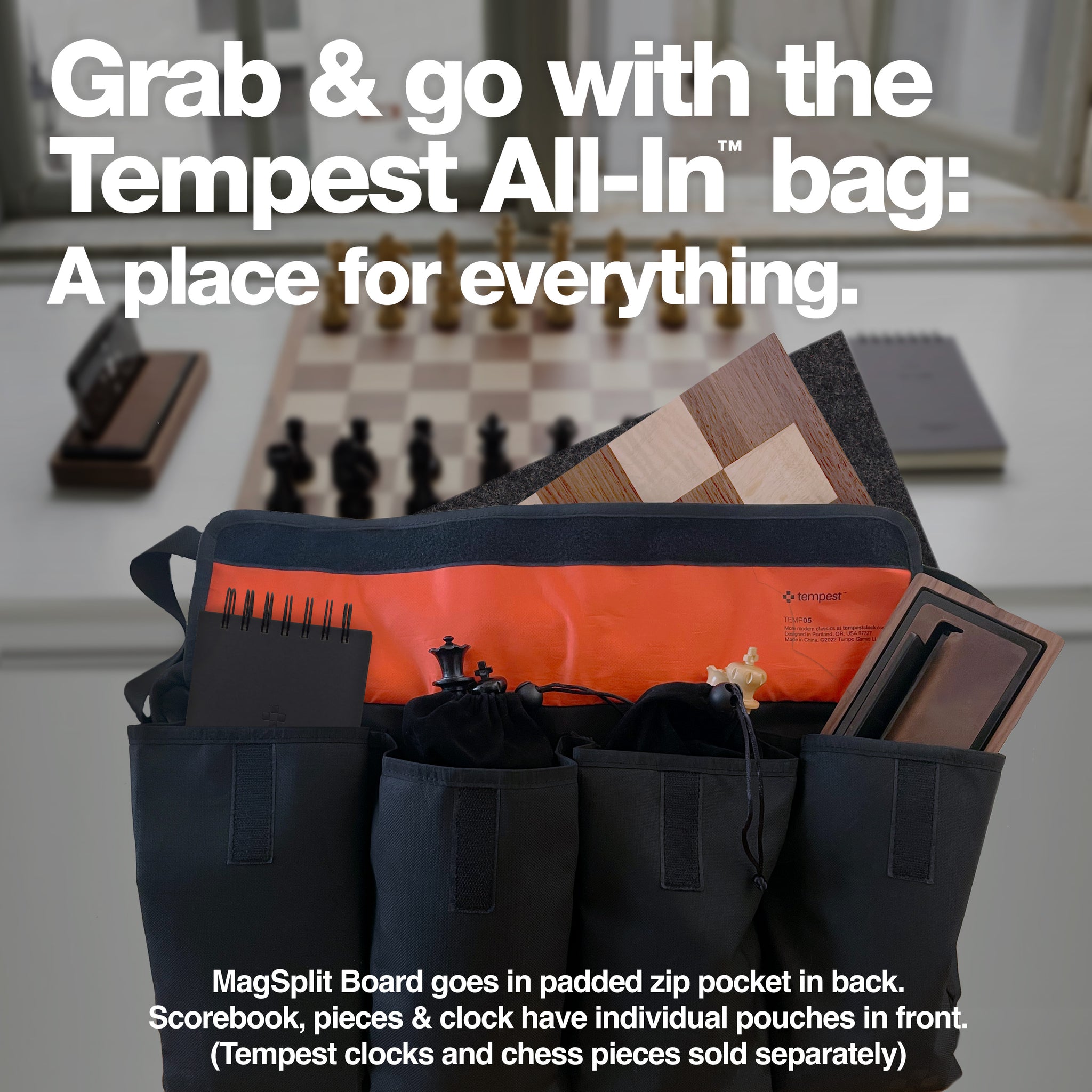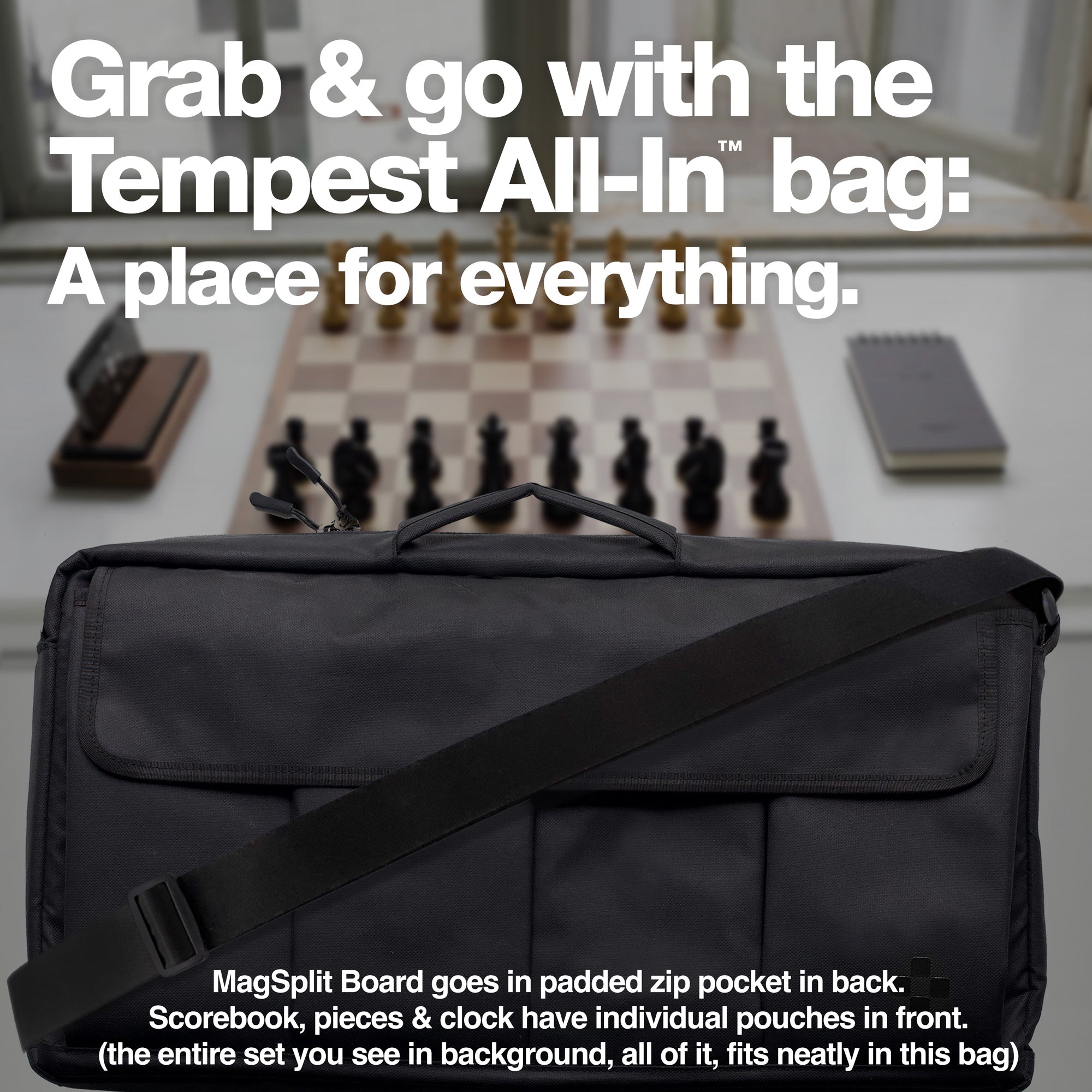 Better together: you get our best discount when you combine the innovative Tempest MagSplit full sized tournament regulation hardwood chess board in Walnut and Maple. Perfectly paired (in color, size and weight) with Tempest's tournament regulation weighted Staunton chess pieces: This bundle includes our take on the famous Reykjavik 1972 Championship chess set as well as the famously innovative Tempest Deluxe Chess Clock / Dock that works with your own smart phone! The set includes a hand-made wooden storage box (hand finished in black lacquer) which stacks nicely on the MagSplit board at home. For on the go play, we include our brilliant All-In weatherproof bespoke messenger style bag. With perfectly considered protective pockets for everything: the board, the black pieces, the white pieces, the Tempest Deluxe clock and our premium scorebook. Save big when combining this perfectly curated ensemble from Tempest.